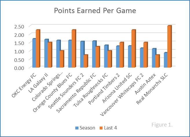 A strong stand-in for Real Monarchs SLC would be Arizona, who has played well enough to earn one point more per game than their season average. Doing so was no easy accomplishment; they beat LA Galaxy II twice in August (at home and away). With two games remaining against top-six teams OKC and Sacramento, Arizona is in position to slay a playoff dragon or two. Arizona’s only loss in the four game span was to Orange County - one of the top-six’s best playing teams.