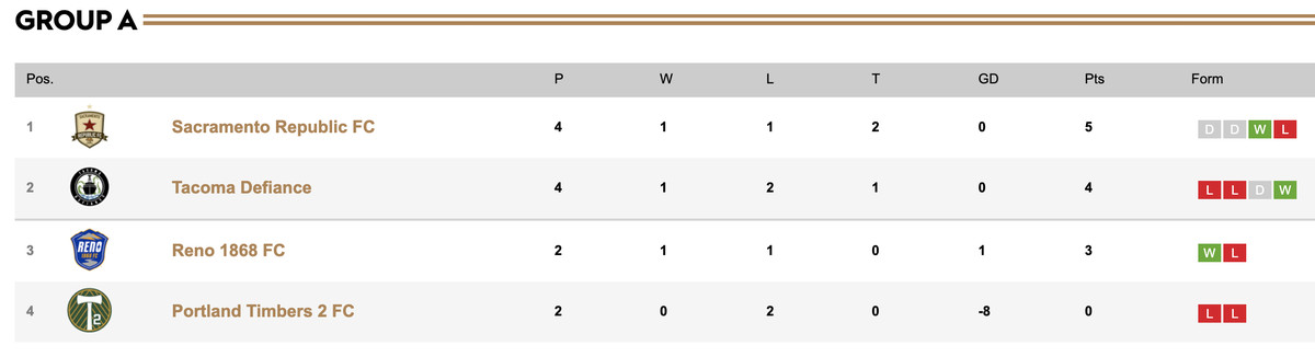 Yes, even with the loss Sac Republic remain atop the standings in Group A. Five points on four games isn’t a commanding lead, as they’re just a point ahead of Tacoma Defiance, but for the moment, the two earlier draws and the loss against Los Dos haven’t actually put them in a hole yet at all. So there’s your silver lining.